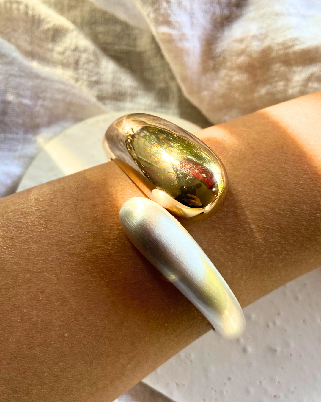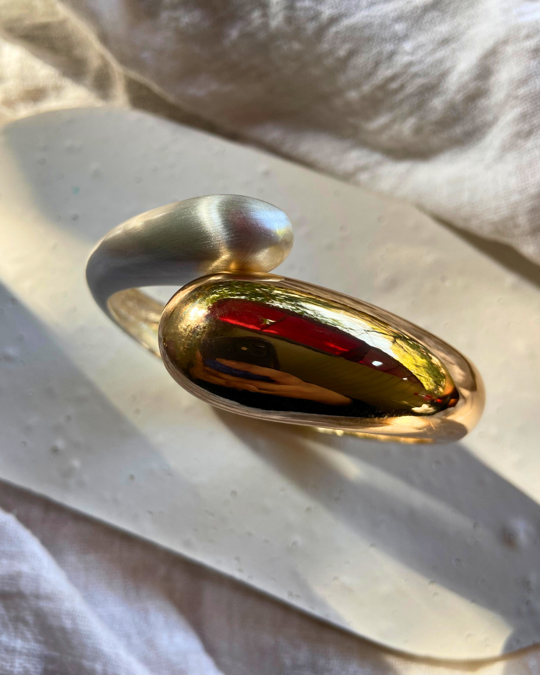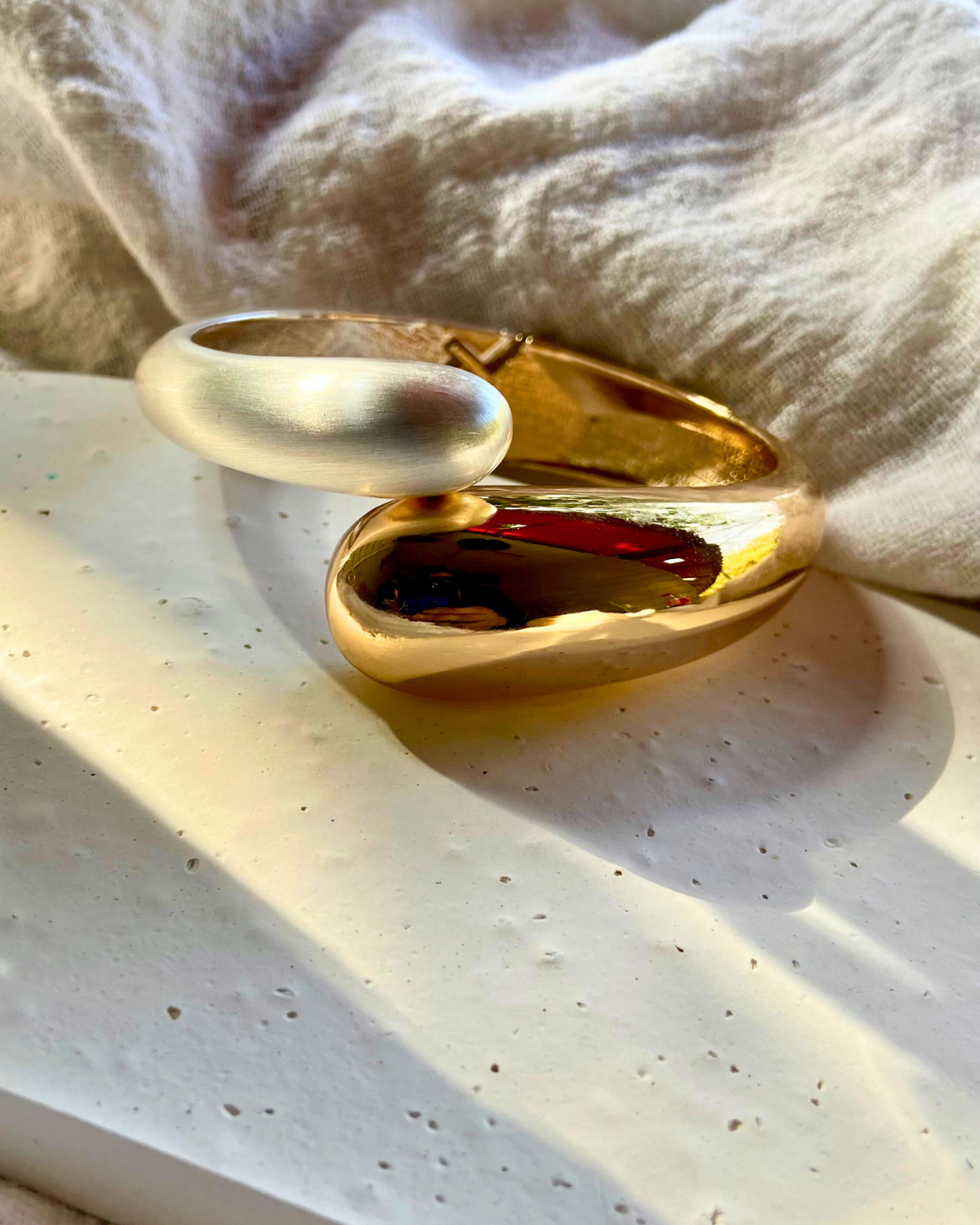 The Azure Handcuff combines elegance and boldness with its striking gold and ivory design. Crafted with 18K gold plating, it offers a radiant, long-lasting shine, while the anti-tarnish and waterproof features ensure durability. The chunky design adds a contemporary edge, making it the perfect statement piece to elevate any look with a touch of sophistication.
