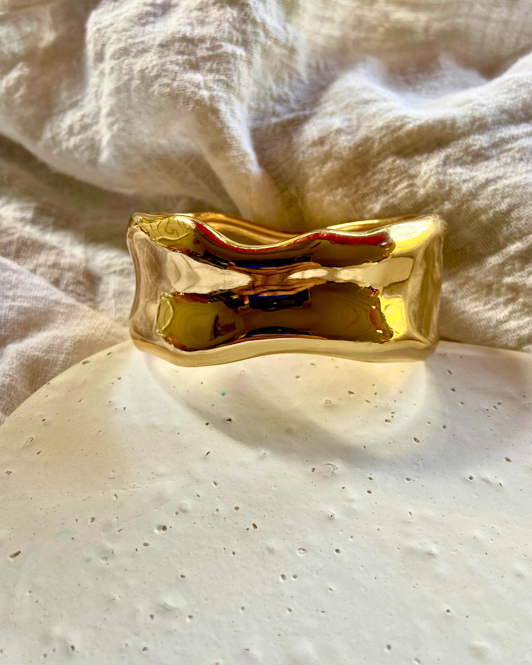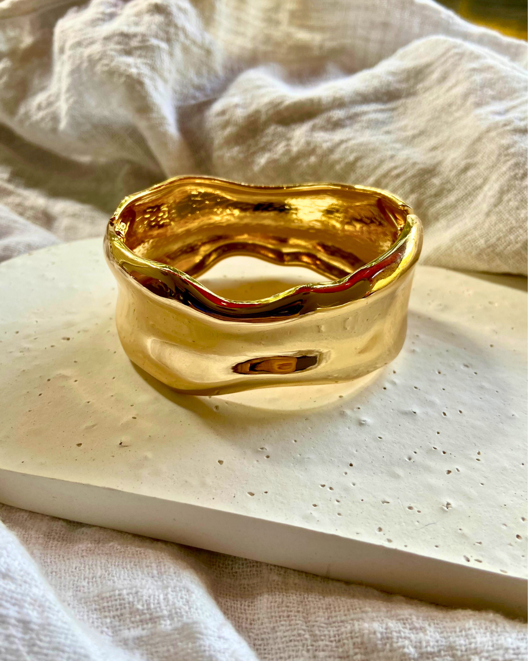 The Elysia Handcuff is a luxurious, 18k gold-plated accessory, designed with a wavy, chunky look for a bold, statement-making style. It’s waterproof, hypoallergenic, and features an anti-tarnish finish for lasting shine and durability. Perfect for those who want a stylish, eye-catching piece that combines elegance with strength.