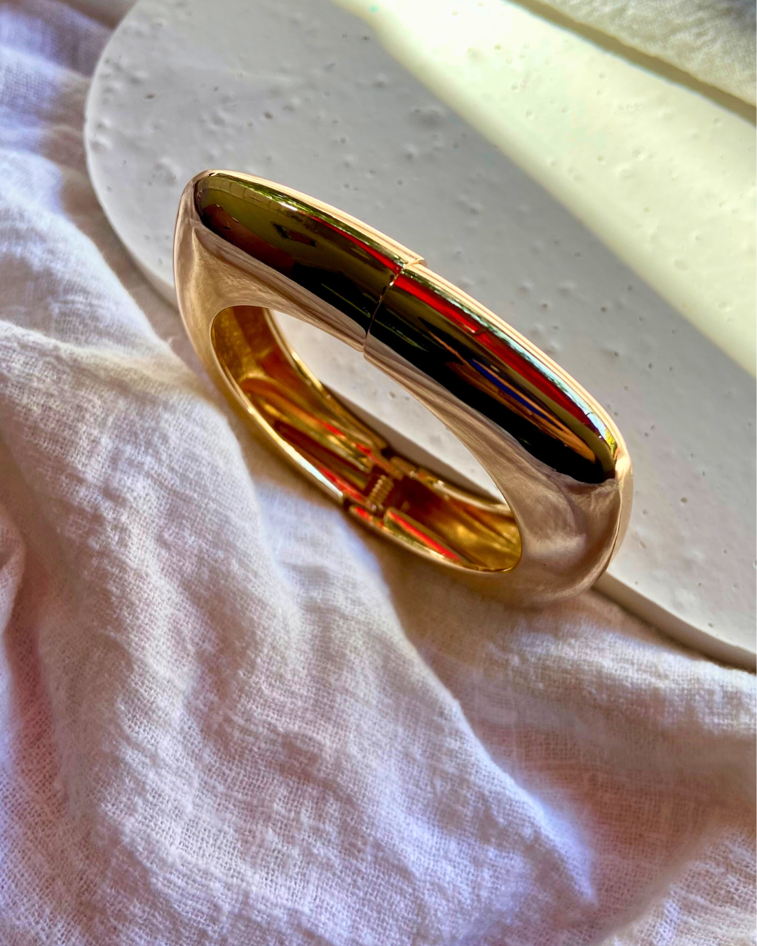 The Lumi Sleek Handcuff features a bold, chunky design with smooth, striking and edgy look. Plated in luxurious 18K gold, it combines sophistication with durability, thanks to its anti-tarnish and waterproof finish.