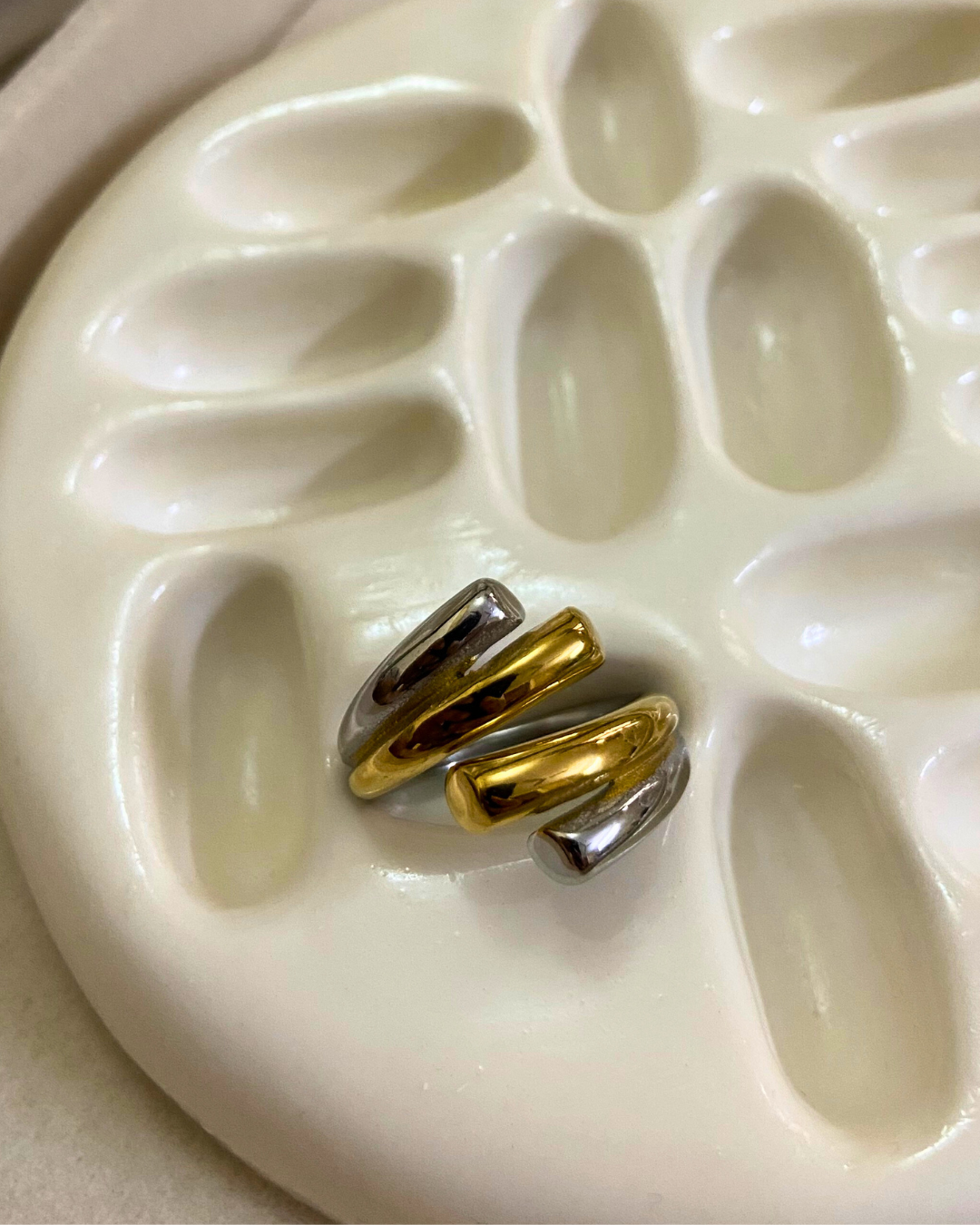 Sleek and modern, the Meridia Ring features a striking blend of gold and silver tones. Slightly adjustable and crafted from stainless steel with 18K gold plating—waterproof, anti-tarnish, and hypoallergenic for all-day elegance.