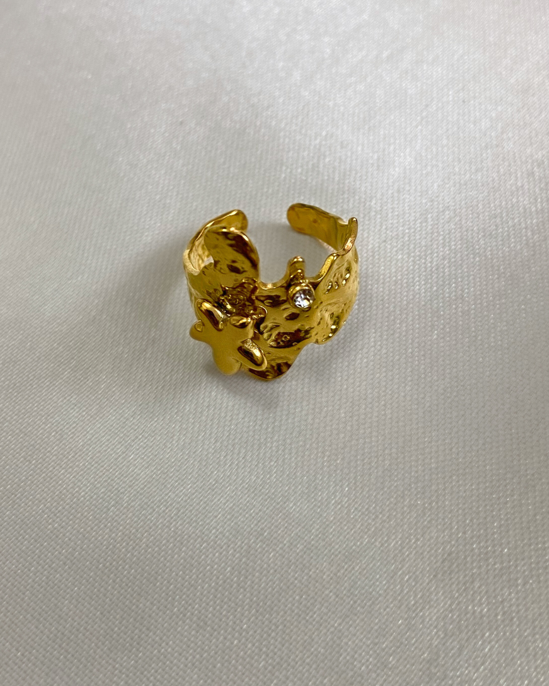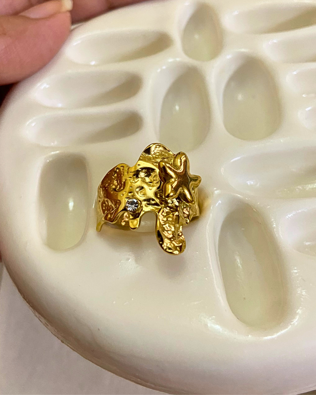 Shine bright with this 18K gold-plated ring featuring a unique star-shaped textured design. Waterproof, anti-tarnish, and hypoallergenic—crafted for everyday elegance and lasting comfort.
